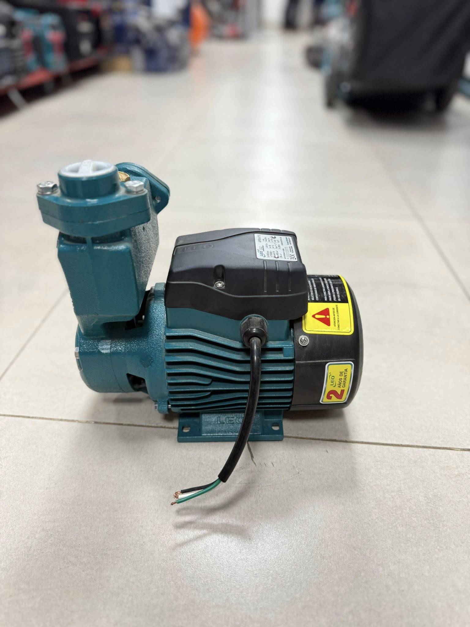Bomba periférica autocebante LEO de 1HP para suministro de agua limpia en hogares y riego. Conexión 1"x1", caudal hasta 40 L/min y altura máxima de 40 metros.