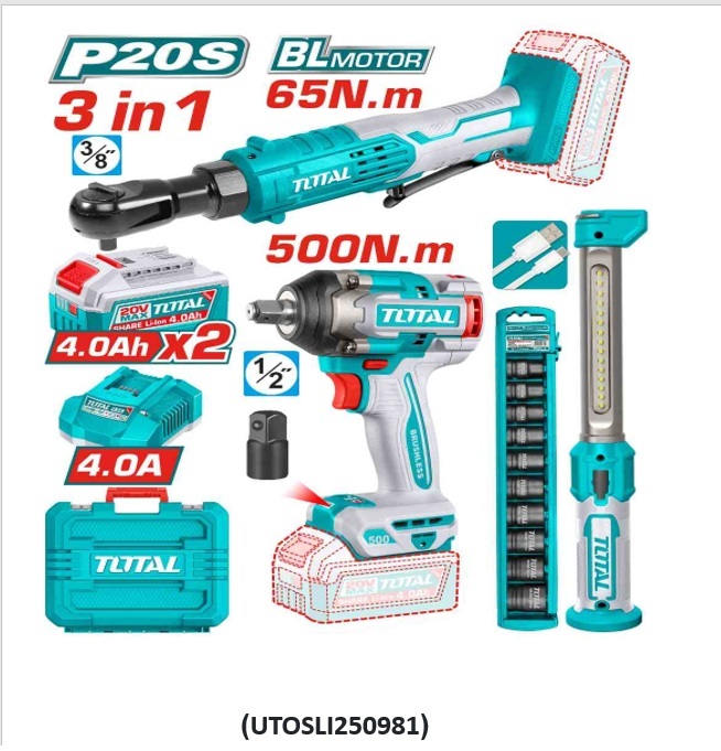 COMBO INALAMBRICO 20V PISTOLA DE IMPACTO 1/2″ 500 NM + RATCHET 65 NM + LAMPARA 300 LUMENES TOTAL 16532