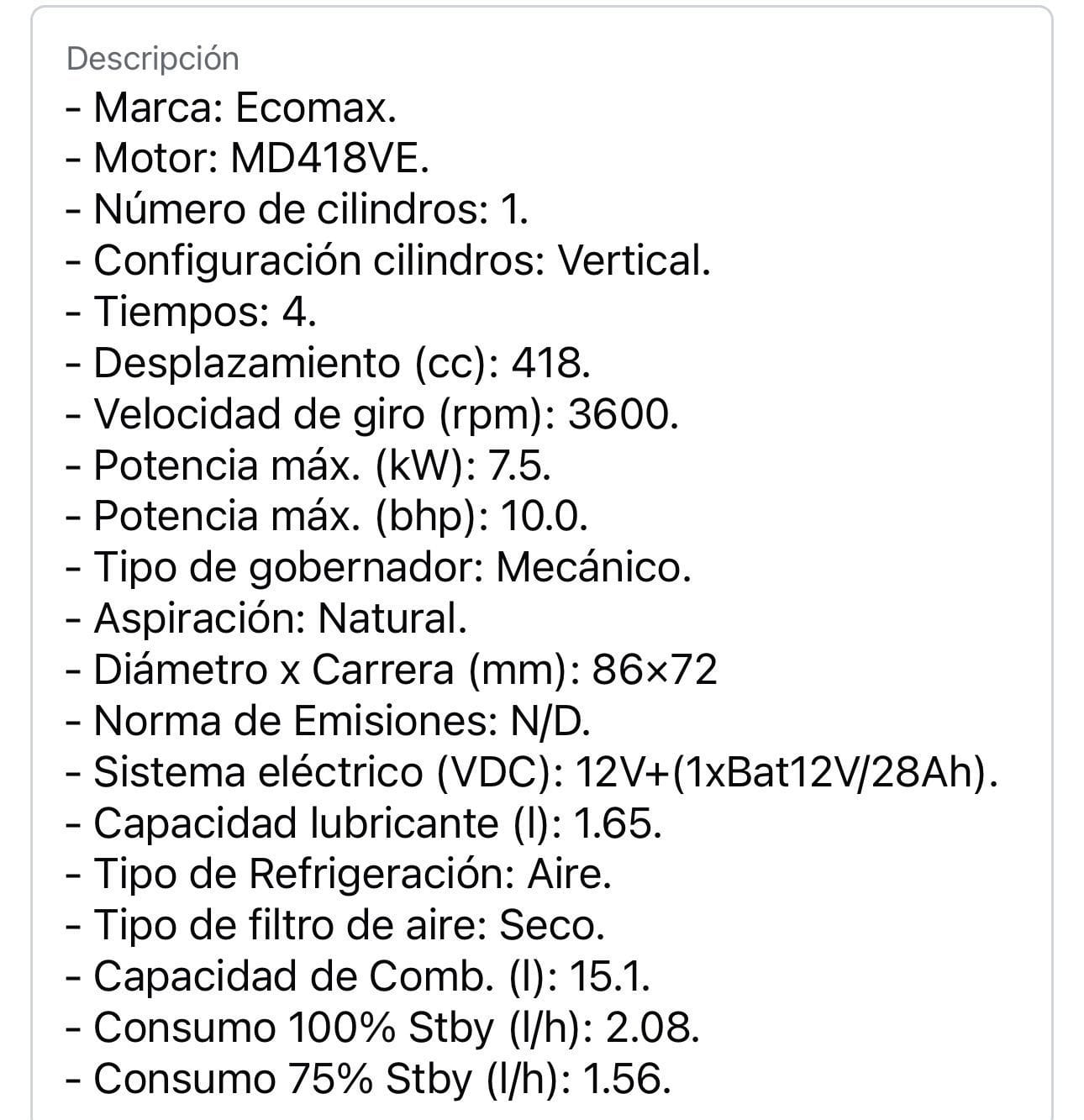 GENERADOR PLANTA ELECTRICA ECOMAX DIESEL CABINADO 6500W GD6500T-L_13385 — ficha técnica