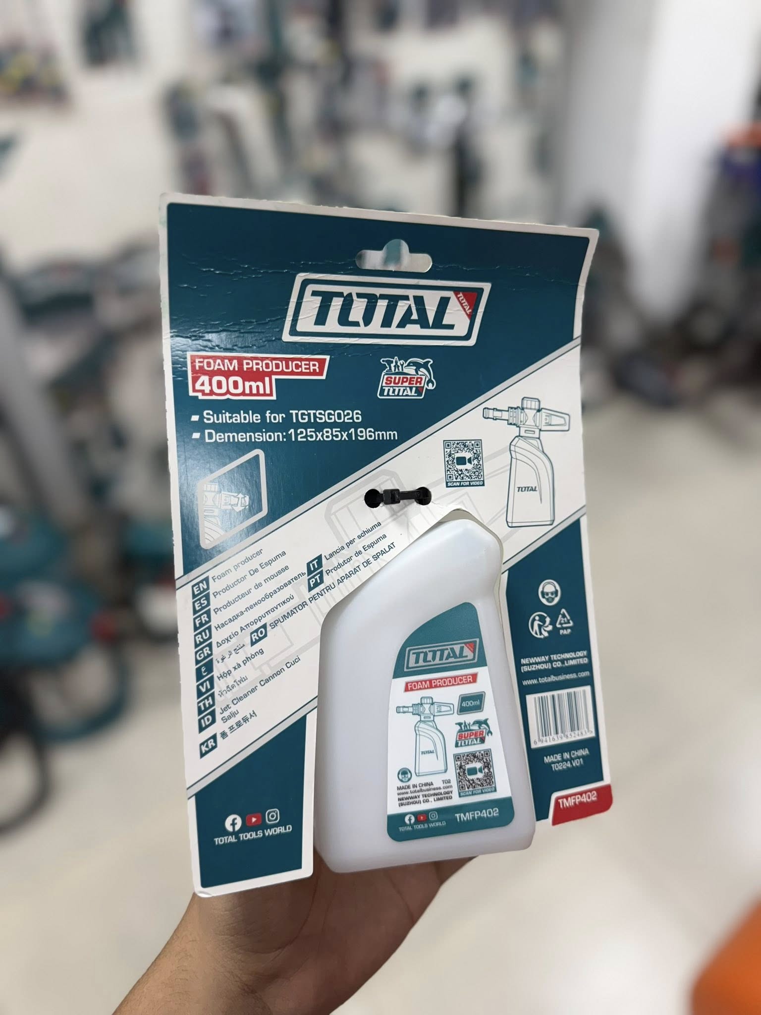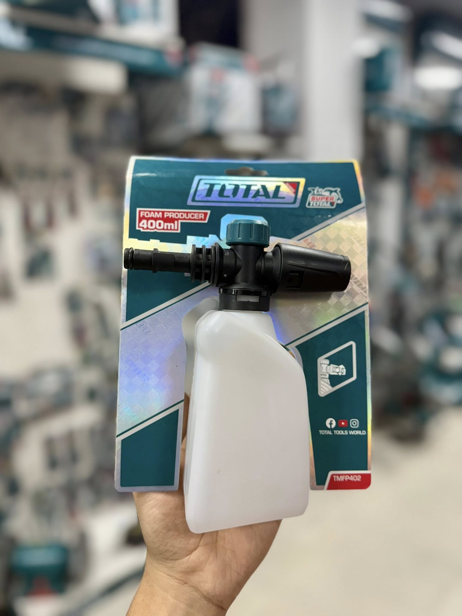 La pistola para aplicar jabón de 400 ml TOTAL es un accesorio práctico y ligero, ideal para generar espuma en tareas de lavado de vehículos, pisos o exteriores. Cuenta con boquilla de caudal regulable y es compatible con hidrolavadoras TOTAL, permitiendo una aplicación uniforme del detergente.
