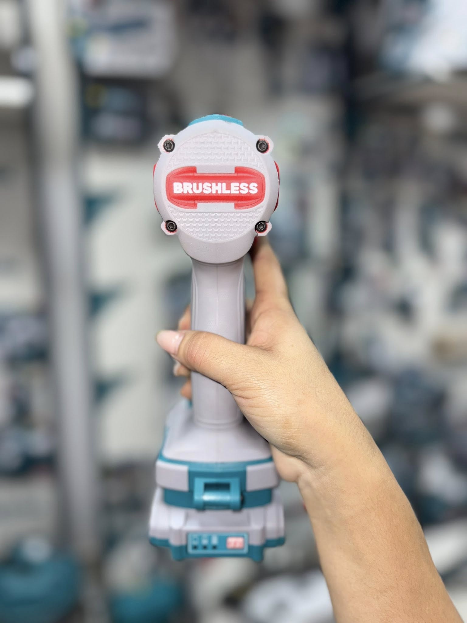 Taladro percutor inalámbrico de 20V con motor sin escobillas para mayor durabilidad y potencia. Incluye 2 baterías, cargador, maletín y 47 accesorios para perforar madera, metal y mampostería.