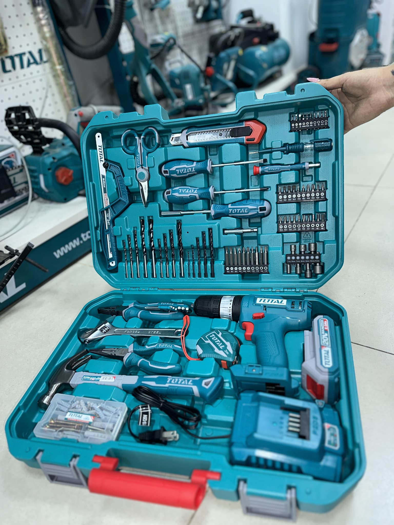 Este kit profesional TOTAL combina un potente taladro de impacto inalámbrico con un extenso set de herramientas manuales y accesorios. Ideal para técnicos, contratistas y aficionados al bricolaje que requieren una solución completa para múltiples tareas de instalación, reparación y construcción.